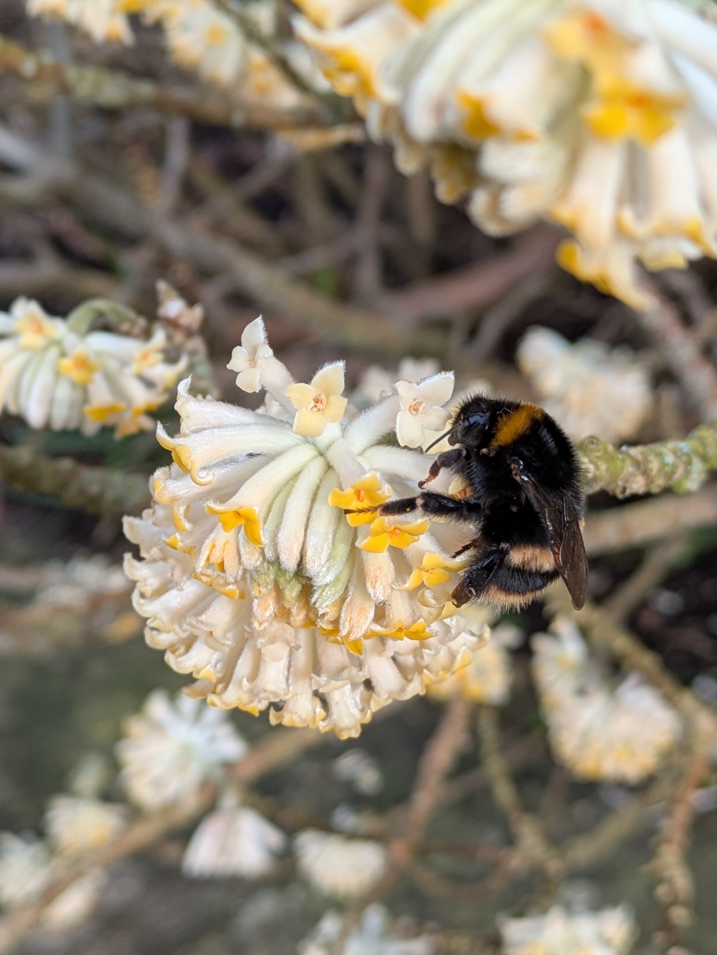Originating from China and the Himalayan regions, Edgeworthia chrysantha is related to the Daphne family and I am not surprised as the flower clusters are extremely fragrant. They appear on the tips of bare stems in late winter, then in spring covered in foliage, consisting of attractive slender leaves, making a nice rounded shape to fit within planting schemes.
