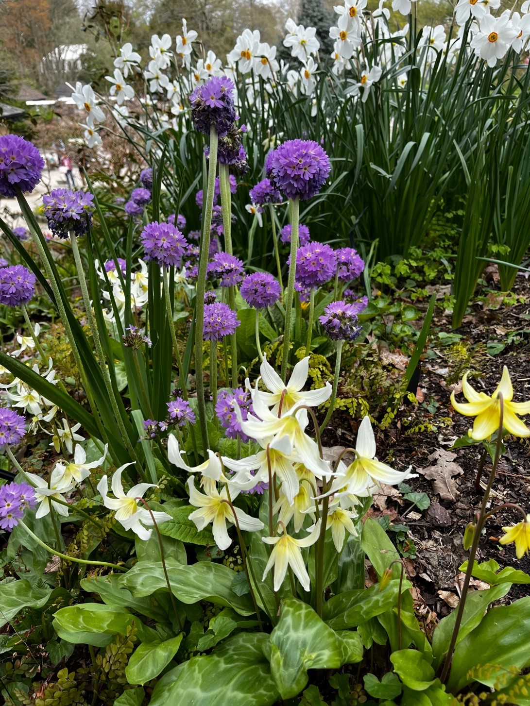 Harlow Carr itself was full of wonderful plantings, and the best was the woodland walk. So many erythroniums! So many trilliums and primulas! The trees were a couple of weeks behind those in London and just leafing up, but there were clearly some really good specimens, and a new orchard planting will extend the woodland. Several other areas had just been redesigned and replanted, perhaps following the lockdown hiatus in visitors. Older features included a formal reflective pool surrounded by scented plants, and banks of white late daffodils. Gardeners were sowing seed in the vegetable section, where a series of raised beds sit on bark paths, surrounded by beautiful woven hazel fencing, with hardly a weed in sight. It put me to shame (must try harder!). And almost best of all, there was an outdoor café run by Betty’s, the famous York tearoom. In all, this trip was a real treat, and I would recommend it to any at CABAHS.