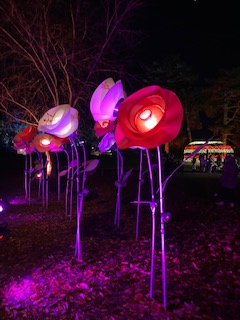 One clever lighting display gave the illusion of blue ‘teardrops’ dripping from a mature tree. (Last year’s Light Show at Well Hall Pleasaunce had a tree lit up and dripping crimson ‘teardrops’ – something I had never seen before!). Each and every one of the displays was magical. One of the highlights was seeing the illuminated interior of the Warm Temperate House of the Winter Gardens, where various shades of green, crimson, purple, orange and blue lights dazzled and highlighted the palms and planting within. The Sparkle in the Park event of 2023 was free to enter and tickets were not required. Don’t miss the next Sparkle in the Park – you will be enchanted.