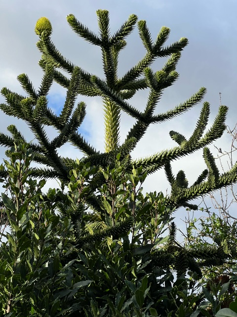 After over 30 years of living in our house and years of neglect, the monkey puzzle tree which was in the garden when we arrived, has decided to seed. Well, at least that’s what we think the cone shaped piece of greenery in the left hand side of the photo shows.
