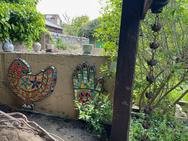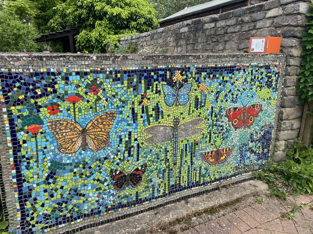 It takes time to walk around and to study the variety of mini-habitats: chalk bank, wildflower meadow, woodland copse, herb garden, stag beetle sanctuary, insect beds, permaculture beds, dry beds, marshy beds, willow fences, rainwater collection – and artwork including mosaics, more mosaics, a smaller wrought-iron commemorative gate, bats and butterflies.