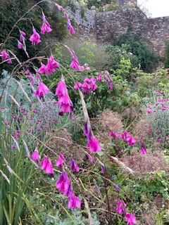 At Sissinghurst Gardens recently, I spotted two Dieramas in flower – the maturer pink-flowering specimen in the sheltered Rose garden, in a front-of-border, corner position where two paths meet, and a smaller, delicate-blush-mauve-flowering specimen growing in a south-facing border, situated in front of a tall brick wall – both looking absolutely gorgeous.