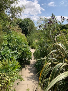 What did I see?   I saw the tall foliage and flowers spilling across pathways; the shimmering of heat; the shadows; the stillness; the reflections and glimmer of the sun on the surface of the pond; the insects darting and humming; and the vast array of exciting planting merging together as a whole, thus creating – to my mind – a contemporary and harmonious work of garden art.  Just Gorgeous!