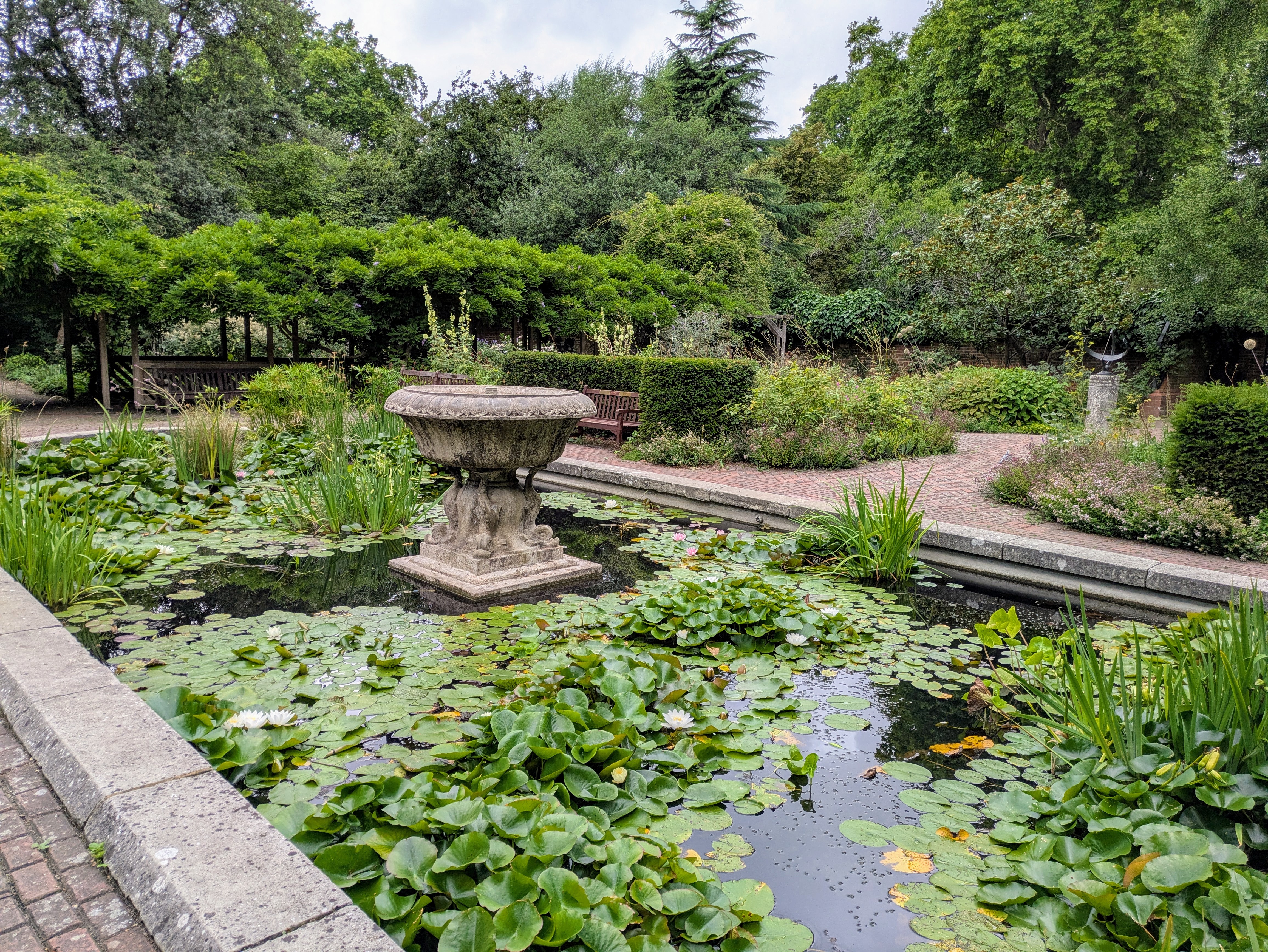 The garden consists of 25 beds, a large ornamental lily pond with central fountain urn, many benches and arches and a sundial. It is quite secluded, with just two gated entrances. A long pergola down one whole side carries the venerable Wisteria as well as climbing roses, star jasmine and other climbers.