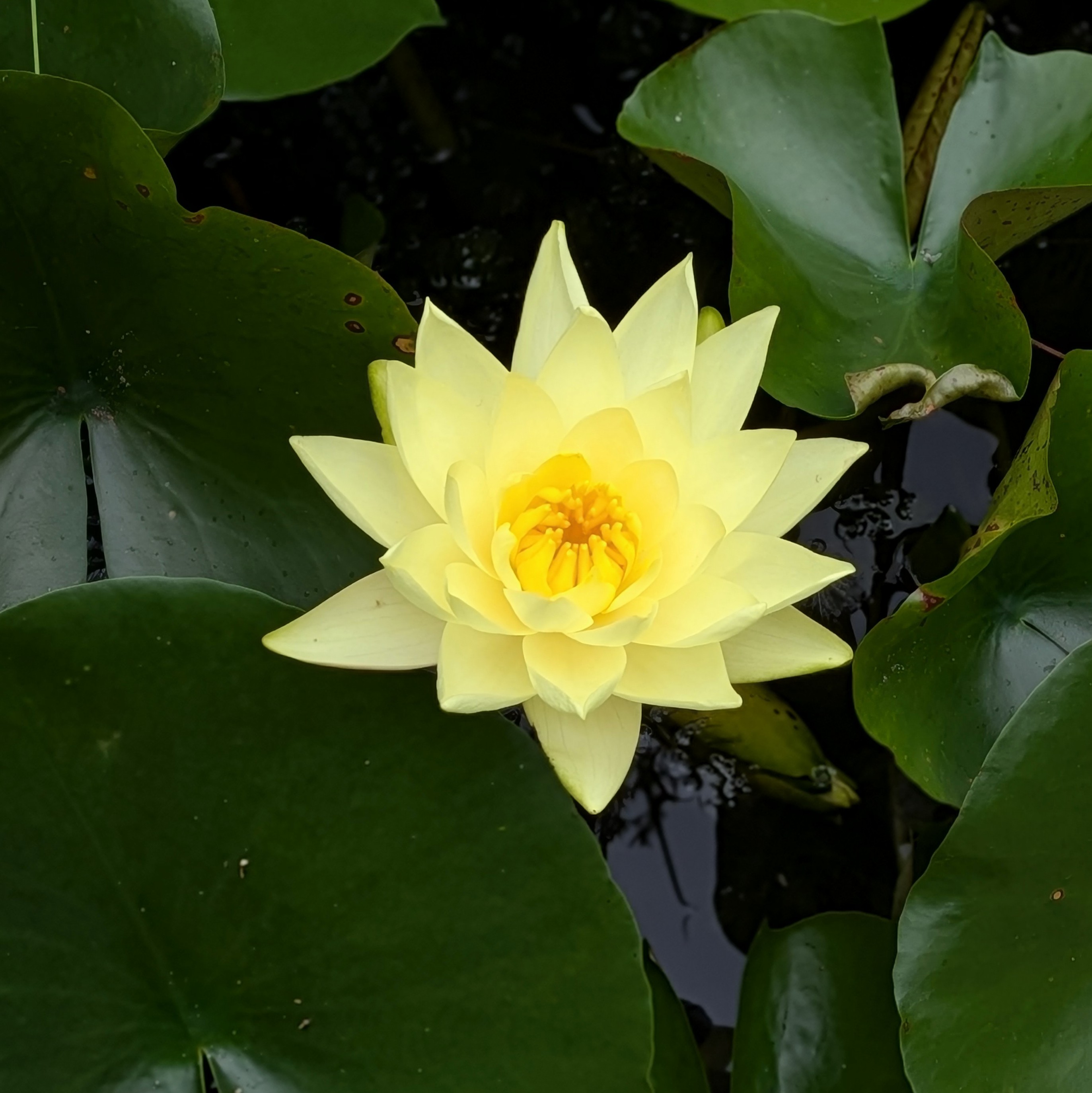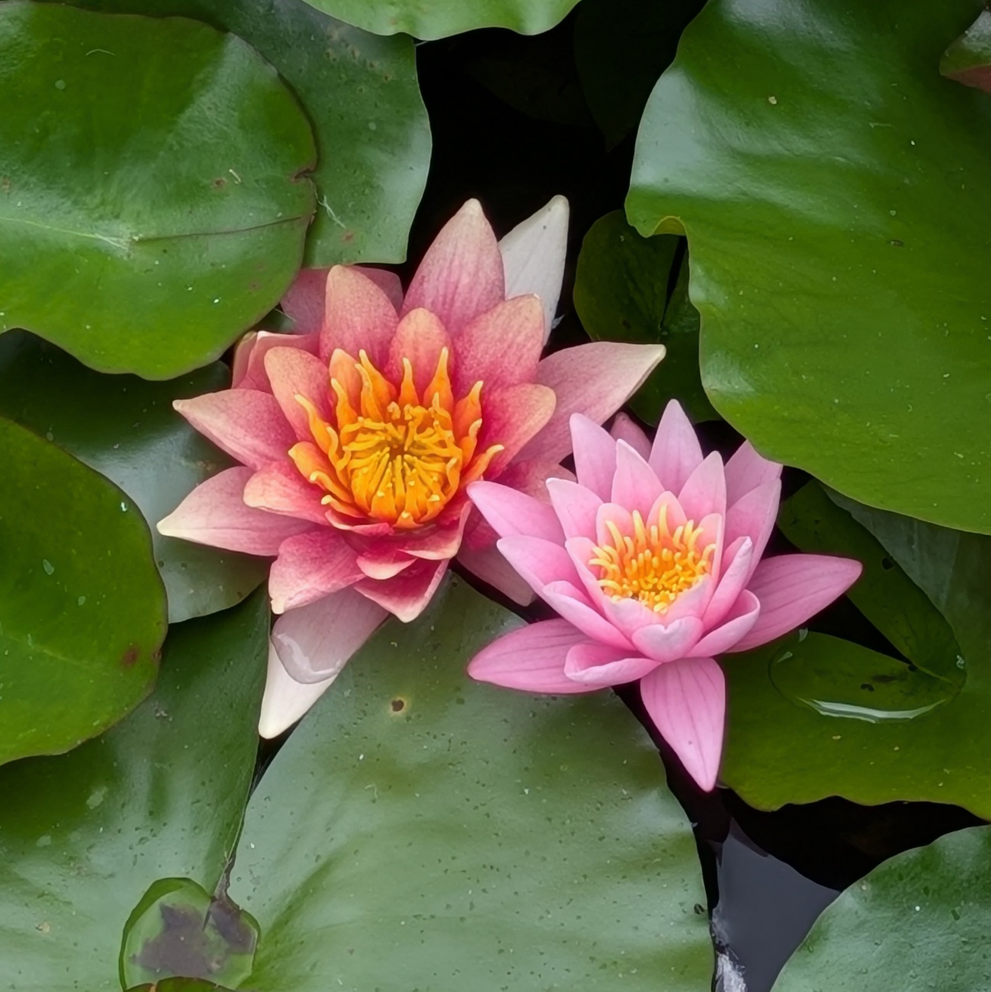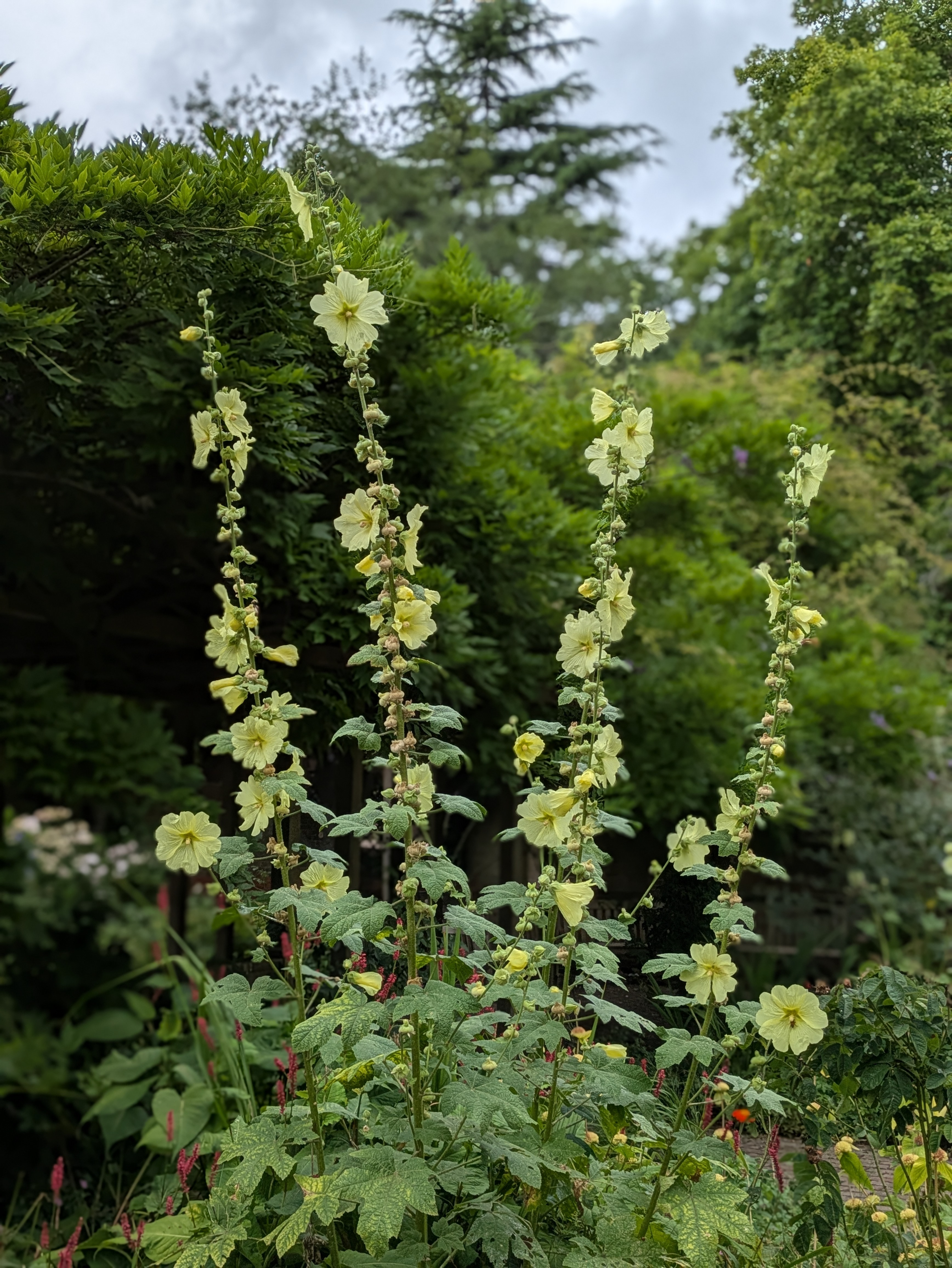 Each pair of beds has different planting, but with echoes from the beds nearest them to give coherence to the scheme. There are lots of perennial plants such as Persicaria, Cardunculus, Geranium, Alcea, Phlomis, grasses and bulbs. There is a backdrop of large trees (including a majestic Ginkgo) and shrubs such as Pittosporum. The planting scheme also includes lots of plants associated with the scents used in Jo Malone perfumes: a pomegranate, roses, irises, pears and so on. The pond has effusive lavender framing one end and has a wide range of different waterlilies.