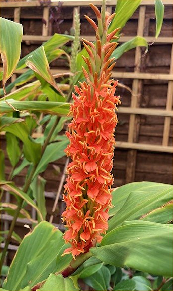 I needed stature and handsome folliage which this plant has, and although it’s suffered during this summer’s drought, I still prefer it growing in a tall container, rather than positioned in a flower bed. The orange candle-shaped flower heads are a bonus, now coming into flower.