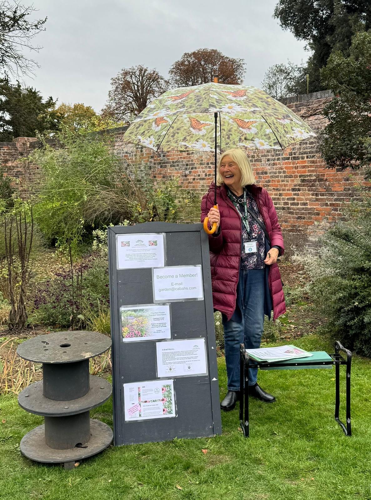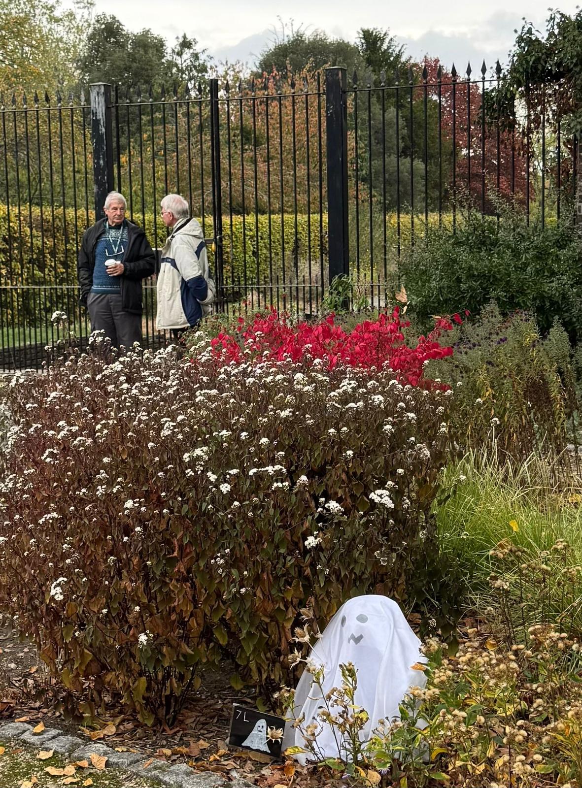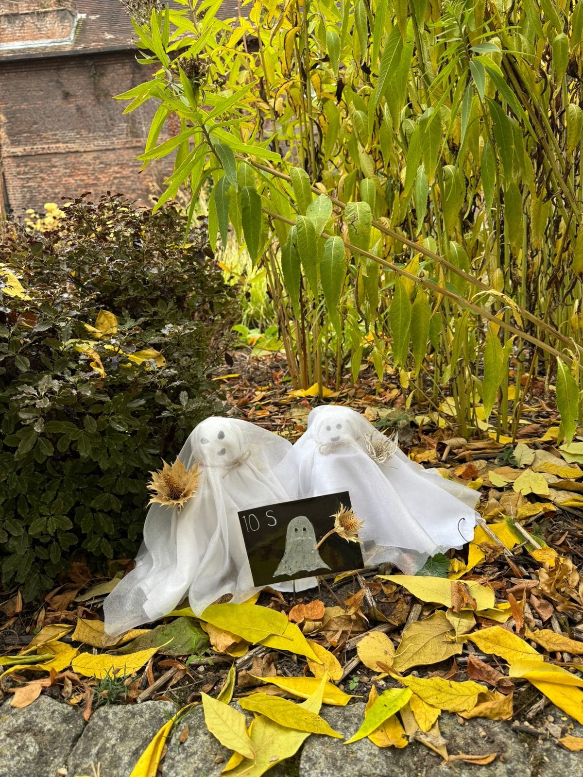 This year’s kids’ trail in the Old Pond Garden was based on ‘Miss Willmott’s Ghost’, with children having to find the ten little ghosts and work out the puzzle of what Miss Willmott was sprinkling (sea holly, Eryngium giganteum)*. Educational as well as fun – maybe we will inspire future gardeners! We had a spectacularly life-like Miss Willmott, donated by Fran, which drew in many punters for a photo-op. The ghosts, bats, spiders, pumpkins hidden around the garden were suitably difficult to find, and the Splat-a-Slug game was a popular break stop.