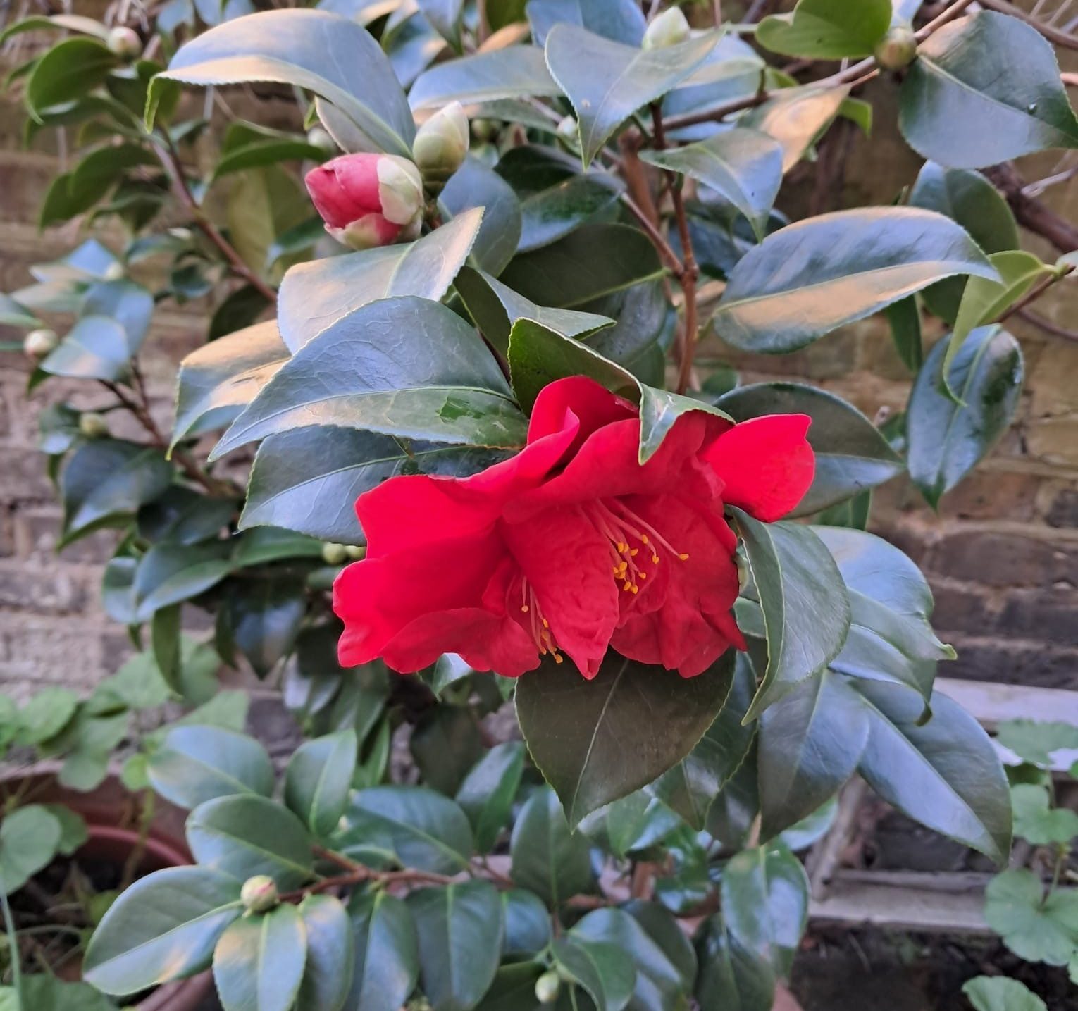 The winter-flowering shrubs were of course out in force (Camellia, Jasminum nudiflorum – winter jasmine, Skimmia japonica, Viburnum – both V. bodnantense and V. tinus, Clematis ‘Freckles’ and Daphne odora), as were the hellebores (though mine have remained resolutely in bud with not a single one opening yet!). Mandy A’s Loropetalum (Chinese witchhazel) was in flower, as were several people’s Hebes. My Chaenomeles japonica (Japanese quince) was covered in fruits, but still producing the odd confused flower too, along with a nearby Geranium macrorrhizum and Geum rivale.