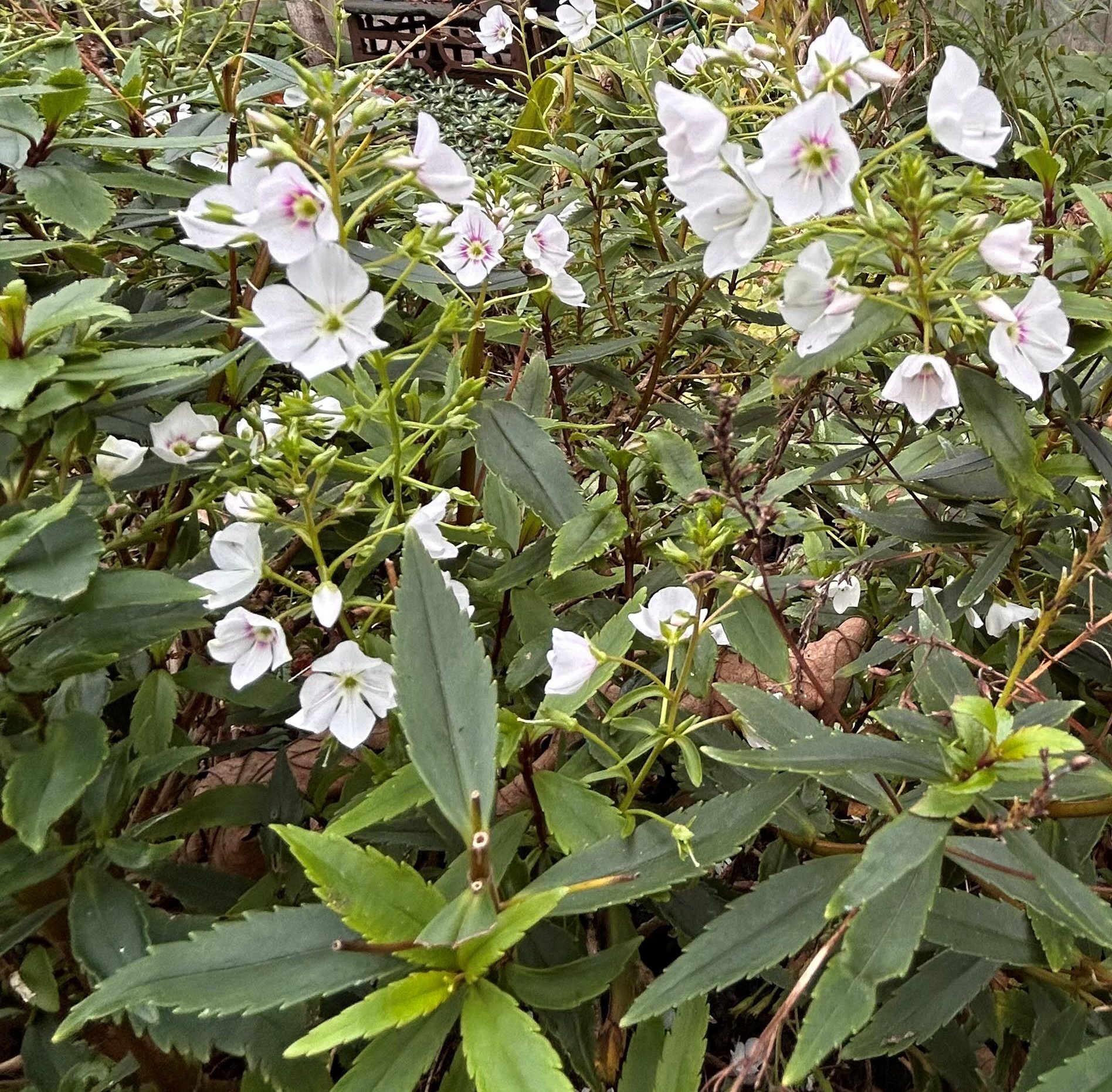 Carolyn H’s garden must be a particularly sheltered microclimate, as Osteospermum, Pelargonium, Veronica ‘Georgia Blue’, Nasturtium, running rockcress, Kleinia fulgens, sweet violet, periwinkle, Campanula and Japanese anemone were all in flower! Heathers were joining in, and Fuchsia ‘Snowcap’ was in bud. Lynne L had honeysuckle and more Campanula, Tim H found a still-flowering Petunia in a hanging basket, I was astonished to see a little pot of Bidens still going strong, and Vicky F had flowers on Solanum jasminoides as well as Salvia. Another tender bloomer was Mandy H’s lovely Euryops pectinatus, and my Rudbeckia triloba was still bravely flowering. And finally, Kathy A reported flowers on Plectranthus, Lobelia, Nigella, Oenothera lindheimeri (formerly Gaura) and Abutilon, as well as Parahebe and Lamium.