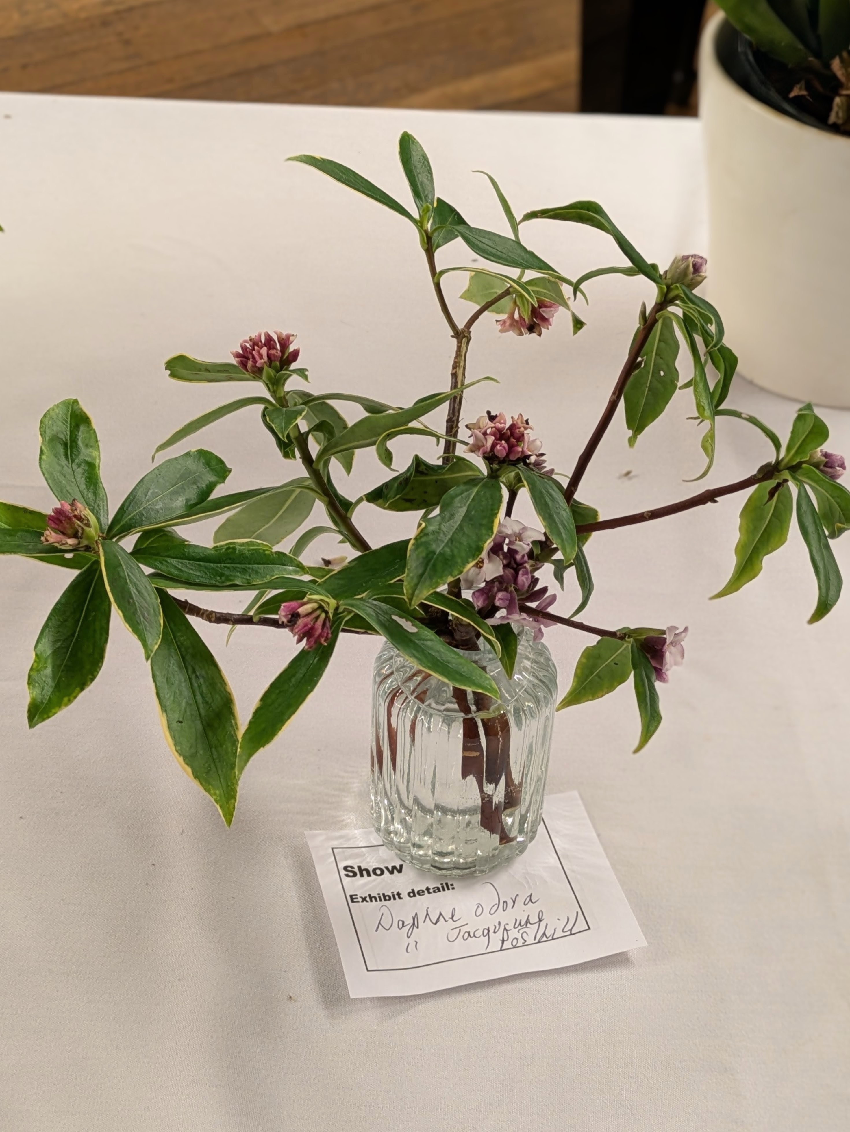 There were some thriving and unusual houseplants, as befits a mid-winter show. The three garden-plant entries had something in common – incredible scent, which drew you to the table before you could even see them. Two included Daphne, one entry showcasing the lovely form of Daphne bholua ‘Jacqueline Postill’. There was also scent from Viburnum farreri and Lonicera fragrantissima (winter honeysuckle), one displayed amongst a generous range of winter berries. Kay won the prize this month, for her delicate selection showing winter form and colour – including, appropriately enough, a winter-flowering Clematis (C. urophylla ‘Winter Beauty’).