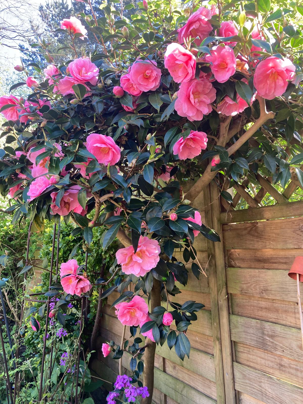 Recently I was thrilled to be invited to see Pat K’s garden, which was a sea of enchanting spring flowers, including Primula, Narcissi and tulips – all absolutely lovely. But it was Pat’s Camellia x williamsii ‘Donation’ (a variety honoured with an Award of Garden Merit in 1941 for its ‘outstanding performance, ornamental value, and reliability’), absolutely covered in flowers and buds, that contributed to the overall harmonious effect. It brought the garden together by becoming a focal point, with its large, rose-pink (semi-double) flowers dazzling the eye and also shimmering in the sunshine. Truly enchanting.