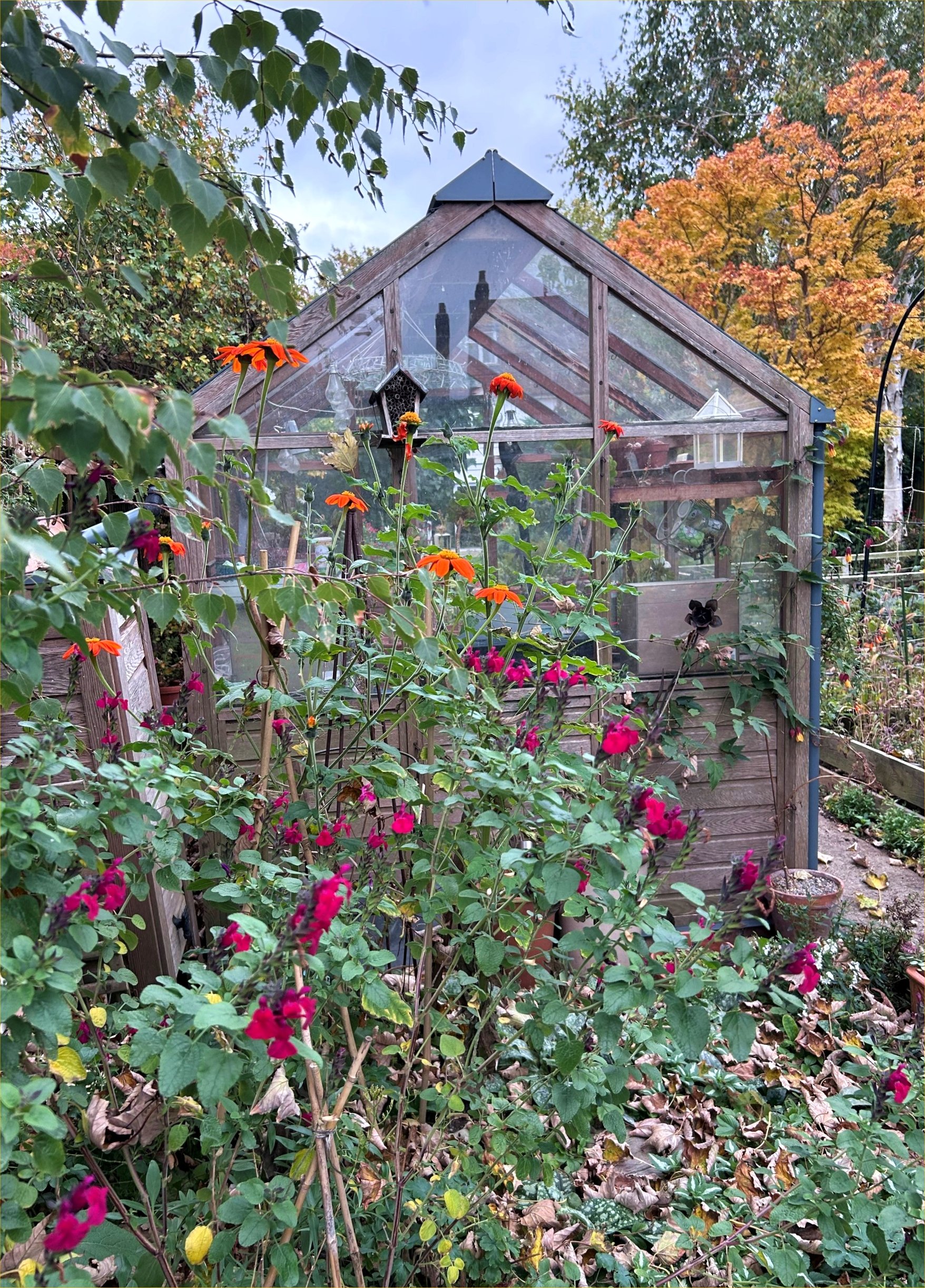 This year’s ‘autumn colour’ seems to have developed quite suddenly and intensely, but may be short-lived. So we asked CABAHS members to share photographs of the colour they could find in their gardens this week. The weather has been dull and grey most of the time, yet these late flowers and glowing leaves shine out of the gloom. You can click on the images for more information and to see at full size.