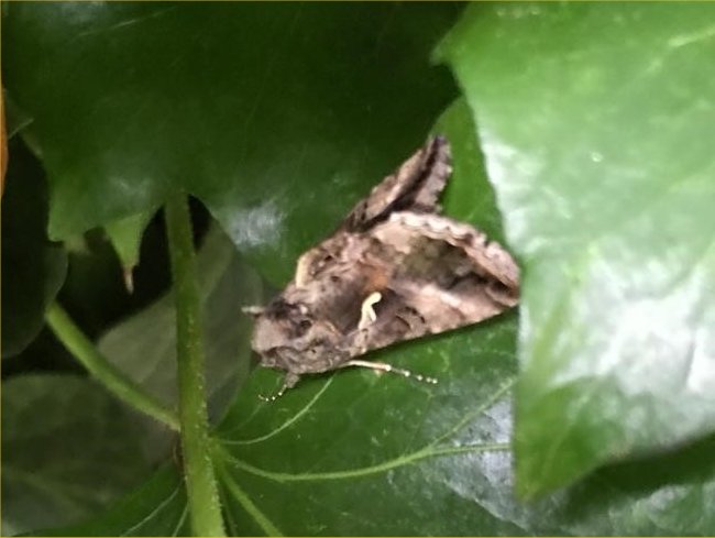 The Silver Y moth is named for the bright, silvery ‘y‘ shapes on its wings. Can you see them in the picture?
