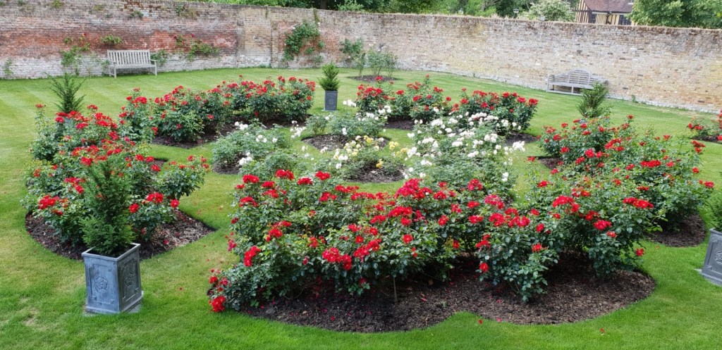 The Gatehouse bordersRoses (red one is WB Yeats) grown in a bed in the shape of a Tudor Rose