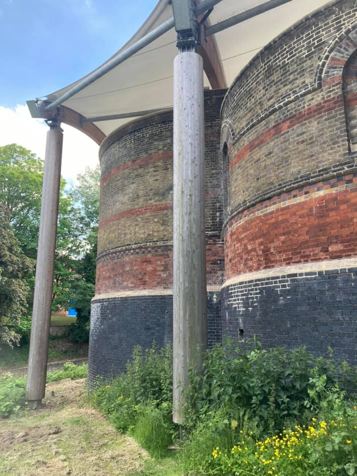 Marsden Road itself is remarkable: its houses all along have designer ironwork gates & railings on wildlife themes, and each lamppost has a ‘squirrel’ high above. These, and the wildlife-themed iron gates to CWG, were designed by Heather Burrell: bollards at the entrance and within were designed by Antony Gormley: a gable-end has a large mural of a Goshawk.