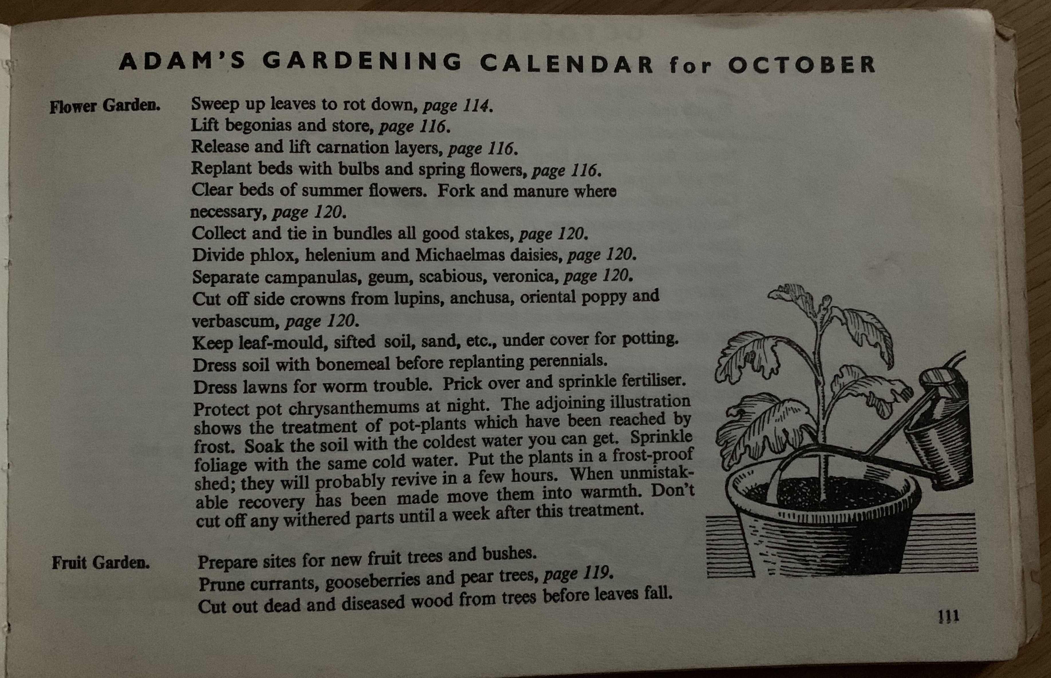 Adam the Gardener, a Sunday Express publication from around 1954, presents the gardener’s year, what to do and when, with illustrations of Adam in action. He never looks very happy and I fear he hadn’t got the advice about digging techniques. I thought I would see what Adam had to say about jobs to be done in the garden in the second week in October. Here’s what I found!