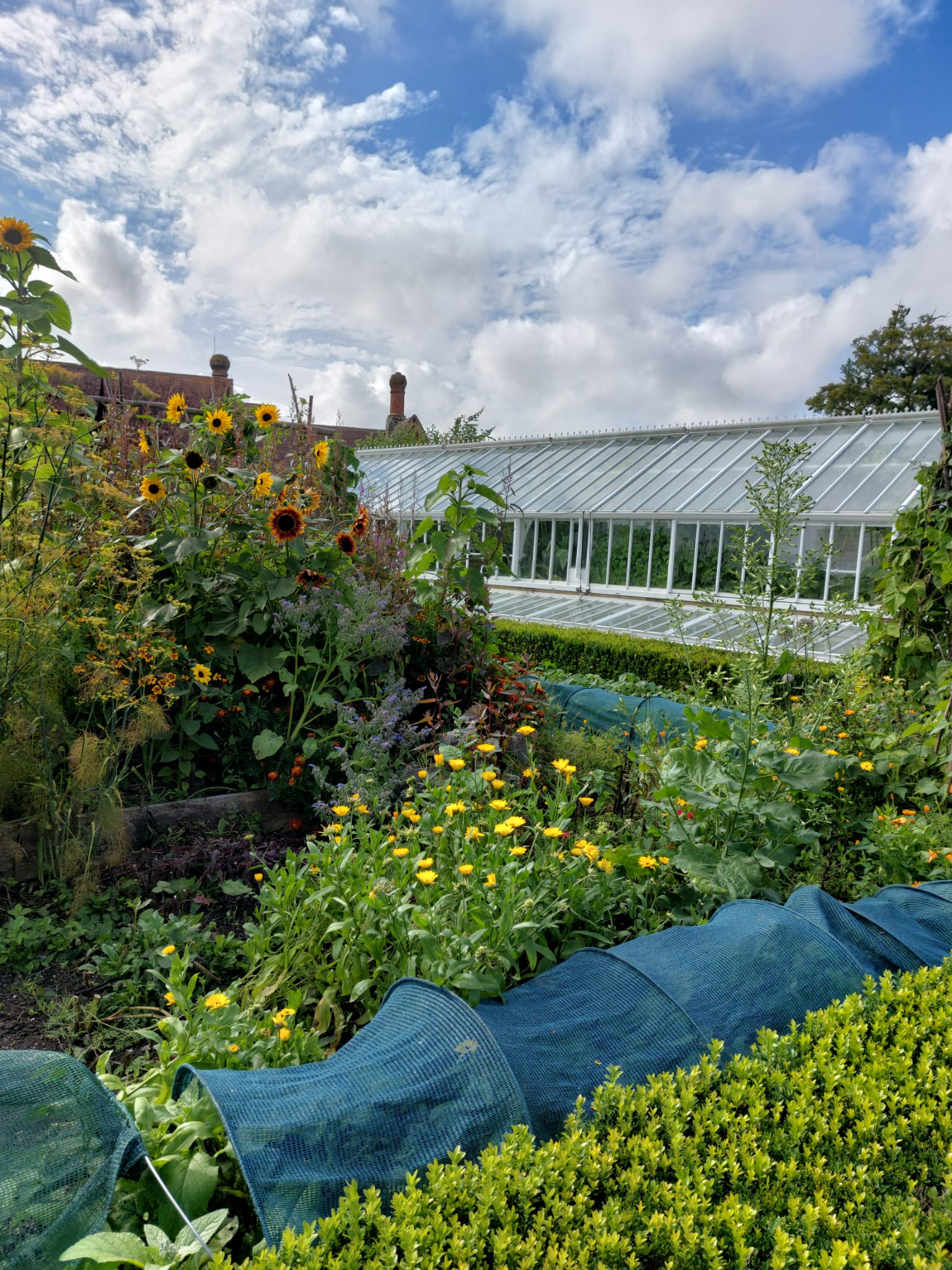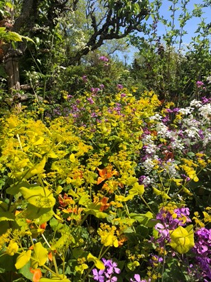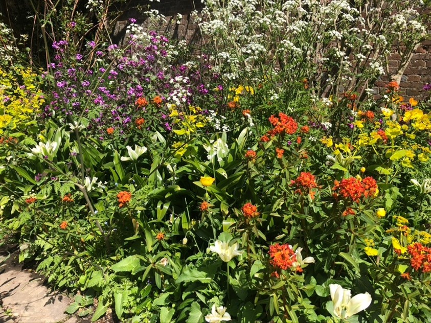 From there we entered a magical place – a charming meadow with mauve-blue spires of camassias threading through and rising above the grasses, a stunning contrast to the shades of green all around. White-flowered camassias were in bud, ready to take over and bloom in the next week or so. In one corner of the meadow sat a toadstool circle, an enchanting addition for children to let their imaginations run wild. We exit beneath the clipped hedge archway into a larger meadow which includes an herbaceous long border, consisting of many taller plants such as grasses and flowering angelica. We follow the path around, to a shaded woodland dell and admire the luminosity of the rhododendron’s stunning white flowers by a gateway entrance, cow-parsley billowing alongside solomon’s seal and pass beneath the 350-year-old oak tree. Amongst the grasses, glistening in the sun, wild orchids are to be admired. We sat on the bench to absorb the idyllic setting before us, noticing glimpses of an old apple orchard beyond the boundary.